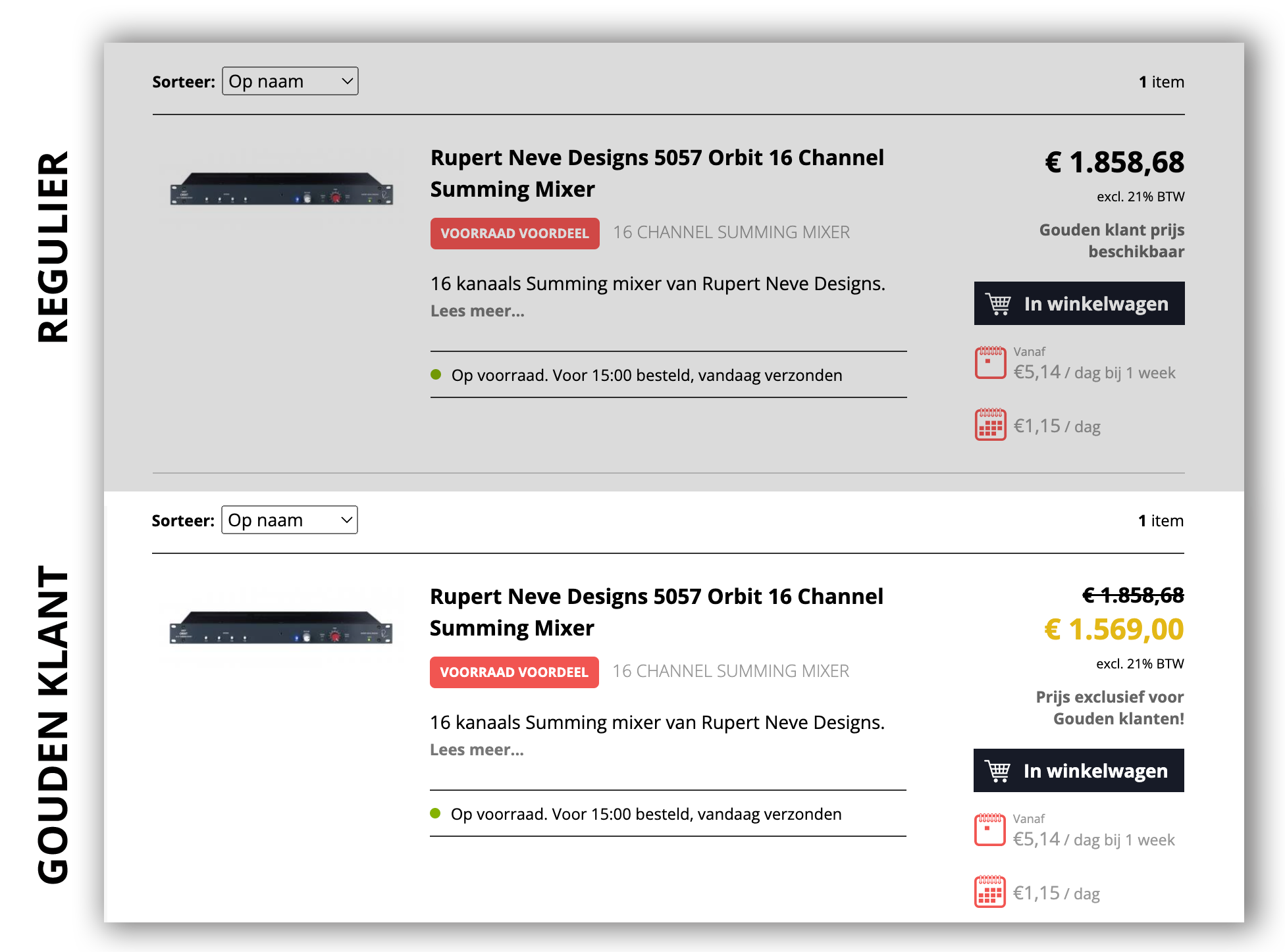 Doorgaans geldt dat duurdere producten meer voordeel opleveren. Om te kijken of een product een Gouden Klant prijs heeft zie je als bezoeker naast de artikelen, onder de prijs,  de indicatie: 'Gouden Klant prijs beschikbaar' staan. Wanneer ingelogd zie je op dezelfde plek de Gouden klant prijs in beeld.