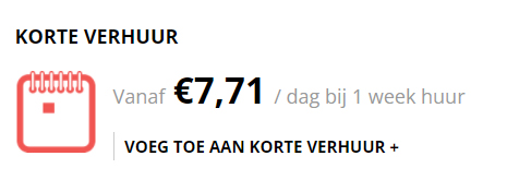 Niet al onze producten zijn beschikbaar voor korte verhuur. De artikelen waarbij de dagprijs per week is vermeld zijn beschikbaar voor korte huur. Je herkent dit ook aan het korte verhuur symbool: