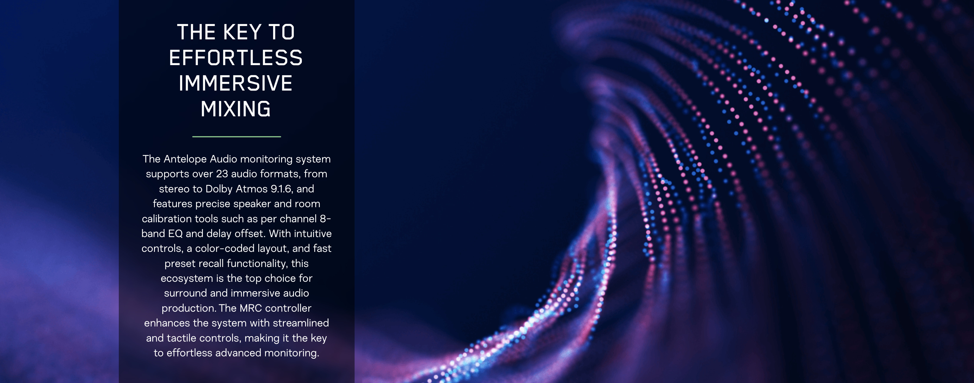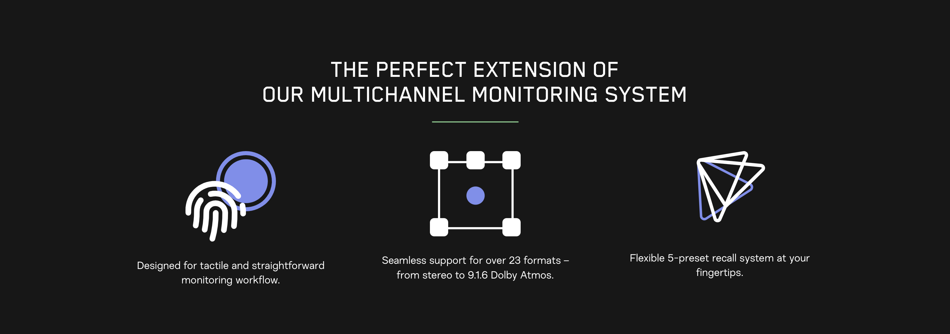MRC is the long-anticipated hardware extension of our acclaimed surround sound and immersive audio monitoring system. The layout of this advanced monitor controller mirrors all major controls of the system for a smooth and intuitive workflow, thanks to fast preset recall and streamlined multichannel functionality.