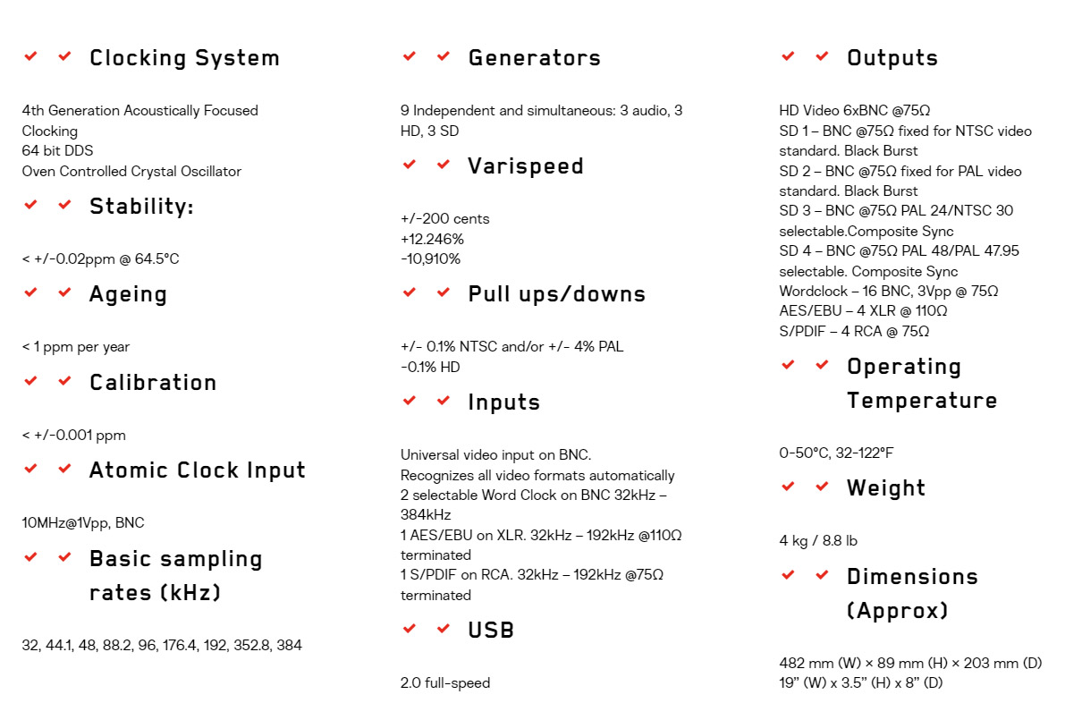Trinity takes care of requirements that usually would have needed several units. With 3 HD and 2 SD generators the unit locks to and generates all known professional video format, while simultaneously offering 3 independent audio channels capable of 384 kHz with varispeed adjustment in cents or percent!