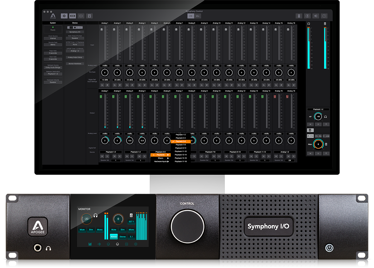 With Symphony I/O Mk II Thunderbolt’s Monitor Workflows, you’ll effortlessly configure and operate your monitoring system for Dolby Atmos, Sony 360 Reality Audio and other immersive audio systems with control of up to 32 Speaker outputs.