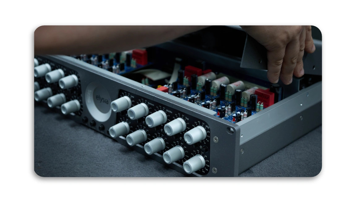 The encapsulated and stepped conductive plastic potentiometers are custom built to Elysia's own specifications, and they are matched to pairs for every single unit. On top of this, the museq does not use any internal audio cabling at all. The result: Superior handling and perfect sound quality.
