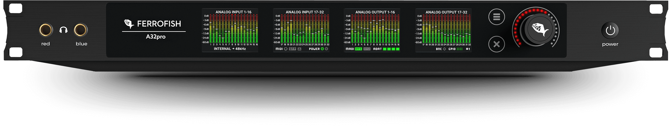 Even operation of the A32pro is done without any compromise, almost self explaining, as with all our products: A total of four multitouch TFT screens show the levels of all 64 I/O channels, it can’t be done better. Controlling the unit also benefits from the screens due to it’s highly intuitive graphical user interface. Remote control is of course also possible via USB, MIDI, MIDI-over-MADI or GPI. Even a simple MIDI CC mode let’s you control the most wanted parameters from distance.