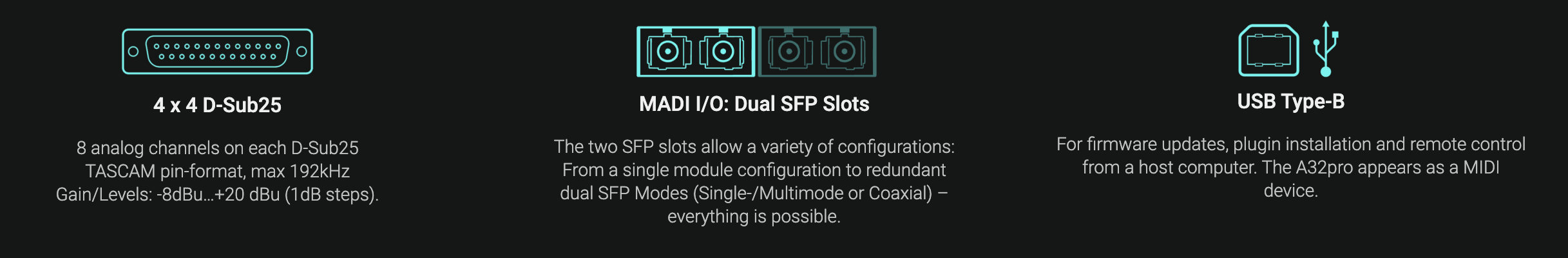 The MADI I/O system of the A32pro is provided as dual SFP ports for MADI modules. So a variety of different configurations (single or double (redundant) in single- or multimode or coaxial) is possible. The I/O support MADI delay compensation, 64- and 56-channel formats and port redundancy. MADI streams can be used to send and receive embedded MIDI messages.