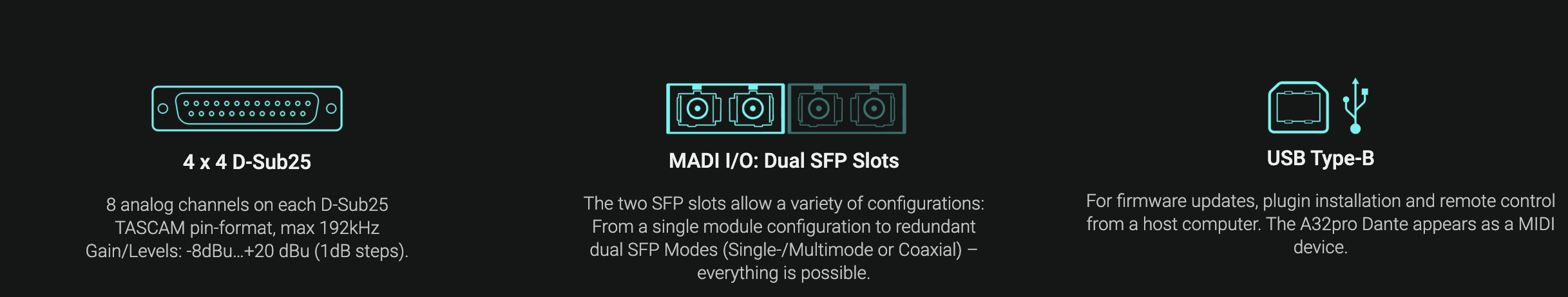 The A32pro Dante is our flagship connecting digital and analog audio to the world of Dante: All interfaces, whether analog, MADI or ADAT, are brought using the integrated routing matrix into the Dante network. Of course, all features of the A32pro are still available.