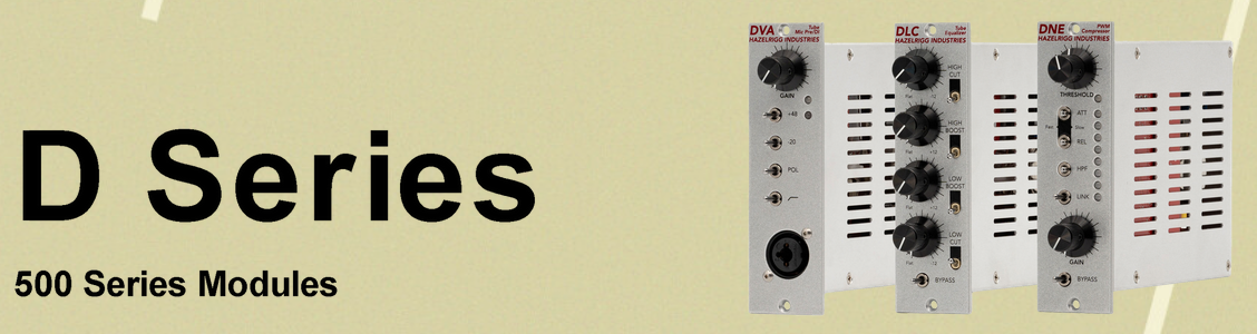 New from Hazelrigg Industries, the D Series of 500 Series modules deliver the tone, clarity and musical control that you’ve come to expect, presented in a portable, cost-effective package. Modules include the DVA Vacuum Tube Microphone Preamplifier/DI, DLC Vacuum Tube Inductor Equalizer, and DNE Pulse Width Modulation Compressor.