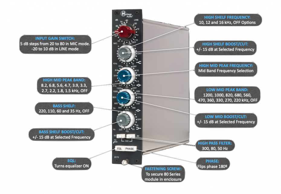 The 8173 module is a Heritage Audio unique design, which has been engineered to fill input module slots in the restoration process of vintage 80 Series sound mixing consoles.