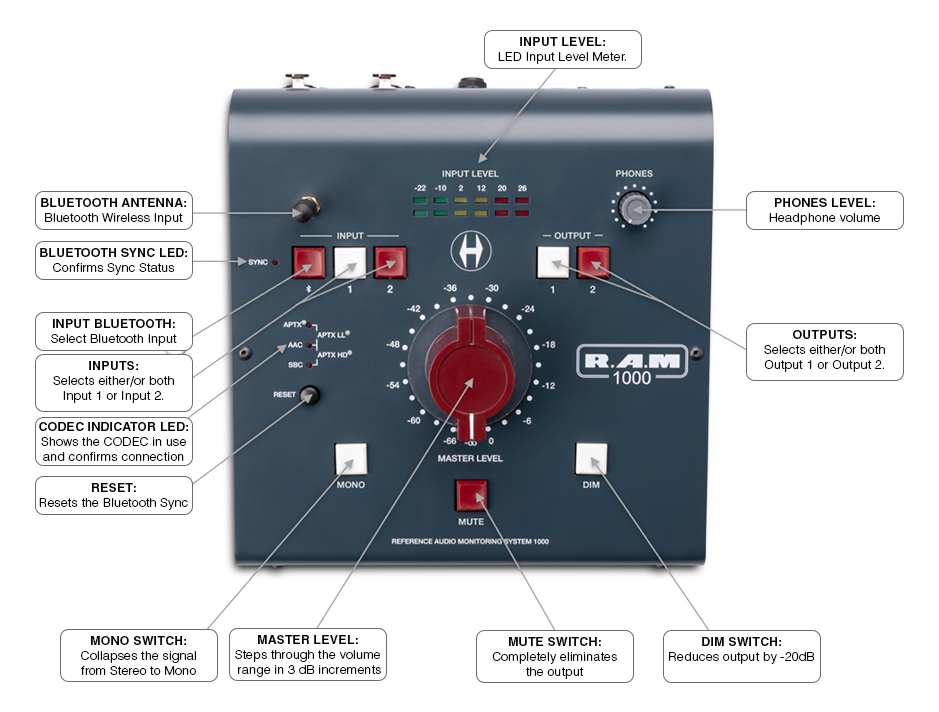 Plus, there is also a Bluetooth input with all the latest CODECS to make sure the highest quality audio is always available. With the R.A.M 1000 it is now possible to simultaneously select any and/or all the INPUTs and OUTPUTs at any given time for even more flexibility. Add to all of this the ubiquitous MUTE, DIM & MONO buttons and a new helpful INPUT LEVEL meter and the result is an all-in-one complete professional monitoring solution.
