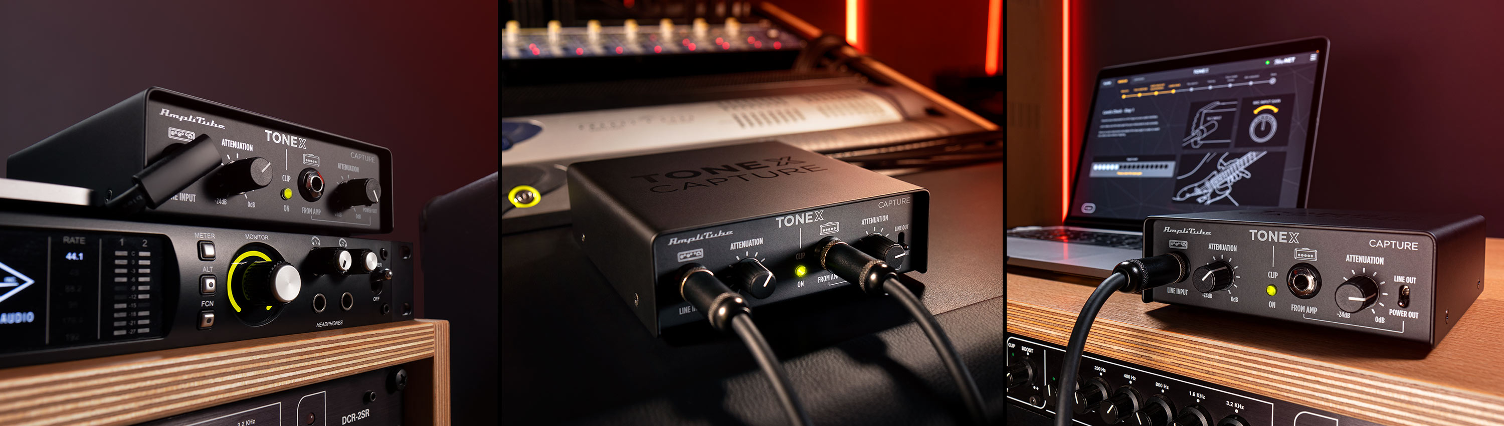 First, TONEX Capture connects to the output of your audio interface and allows you to feed that signal to your amp at just the right level using the left attenuation control. Second, TONEX Capture connects to your amplifier’s line out (a speaker must be connected) or pedal output and allows you to feed that signal to your interface at the right level using the right attenuation control.
