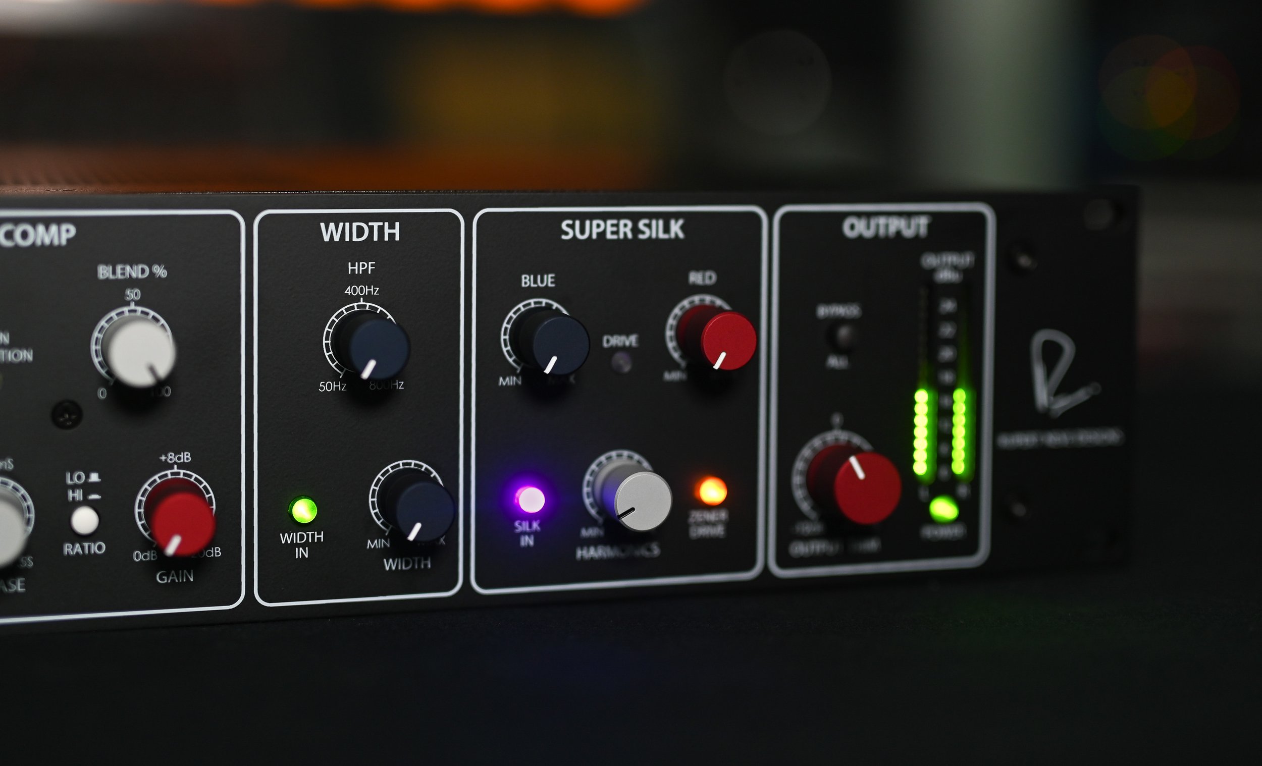 The COLOR COMP is an all-new optical compressor design which “excels at accentuating the non-linear distortion and ‘colorful’ characteristics of the Opto cell”. The ratio can be set to 2:1 for subtlety or 5:1 for more dramatic reduction, the high-pass side chain filter is sweepable from 20Hz to 350Hz to allow low frequencies to pass through uncompressed, release time is variable from 100mS to 1.5S, and the BLEND control provides the ability to compress in parallel with the source material. A green LED indicates gain reduction, and 20dB of Class-A make-up gain is available, intended not only for level-matching but also to drive the interstage transformers found in the SUPER SILK section.