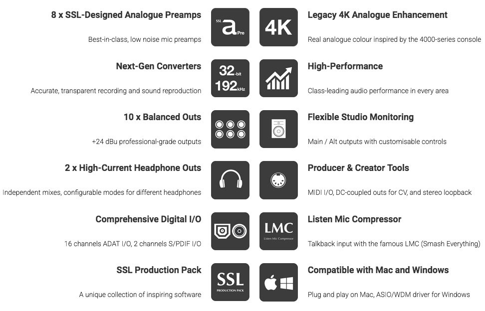 Best-in class 125 dB dynamic range on monitor and line outputs. - Comprehensive management of all inputs and outputs onto the SSL 18 low-latency mixer.