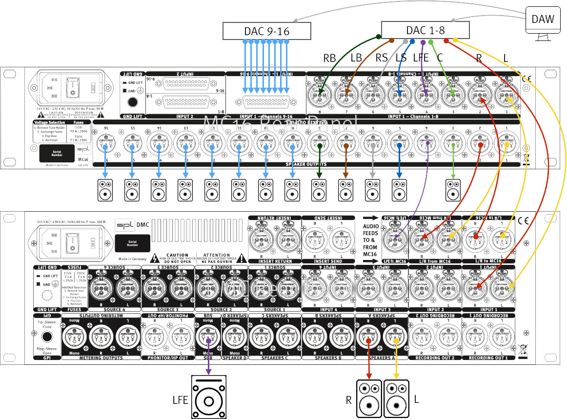 Mastering studios often use the L/R speakers and subwoofer for stereo and multi-channel monitoring. The combination of DMC with MC16 makes it unnecessary to replug these speakers.