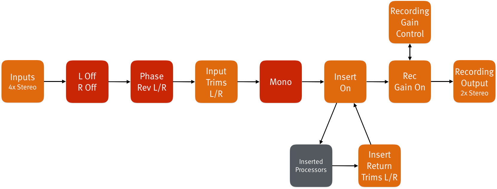 Each input channel can be switched on/off, phase reversed and trimmed in 0.25 dB steps. A stereo input can be switched to mono.