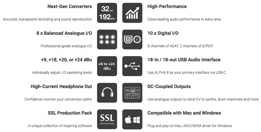 While ALPHA 8 is the ultimate audio interface expander for producers and engineers looking to bring SSL sound and quality to their existing set-up, ALPHA 8 is also the perfect companion to SSL 18. Instantly expand SSL 18’s I/O via ADAT adding 8 channels (1 x ALPHA 8) or 16 channels (2 x ALPHA 8s). Perfect for effortlessly integrating additional analogue outboard processing, analogue mixers and more.