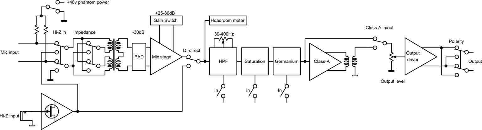 Instead of switching output stages as it was done in the previous models the class-A stage is now inserted in front of the output level control letting you drive the transformer harder without overloading your A/D converters. This also make the output less sensitive to different load impedance. The class-A stage uses a heavy custom made Carnhill transformer that produces a fat and punchy sound with mid-range character and a warm top end. The Hi-Z instrument input has a separate activating switch so that you can let your instrument stay connected all the time. The Hi-Z direct mode function bypass the input transformer and input stage and send the instrument signal direct to the HPF and the selectable saturation and germanium circuits. Direct mode gain is +14dB which is perfect for bass recording together with the class-A stage. The sweepable HPF goes from 30Hz to 400Hz which allows precision crafting of the low end.