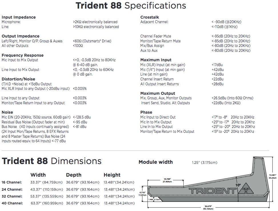 The Trident 88 is a classically styled, in-line, eight-buss analog console and an advancement in lineage of the revered Series 80 mixing desks. Designed with manufacturability in mind, the 88 is artfully constructed for ease of use and workhorse reliability. Along with the pleasingly familiar routing and feel of a classic Trident desk, are modern refinements that serve to improve functionality, workflow and performance specifications. For example, integration with outboard processors and mic pre’s, such as the 500 format, is provided simply and elegantly by means of an exclusive, switchable input, which bypasses the channel preamp circuitry and allows for insertion of external signal sources directly to the channel equalizer.