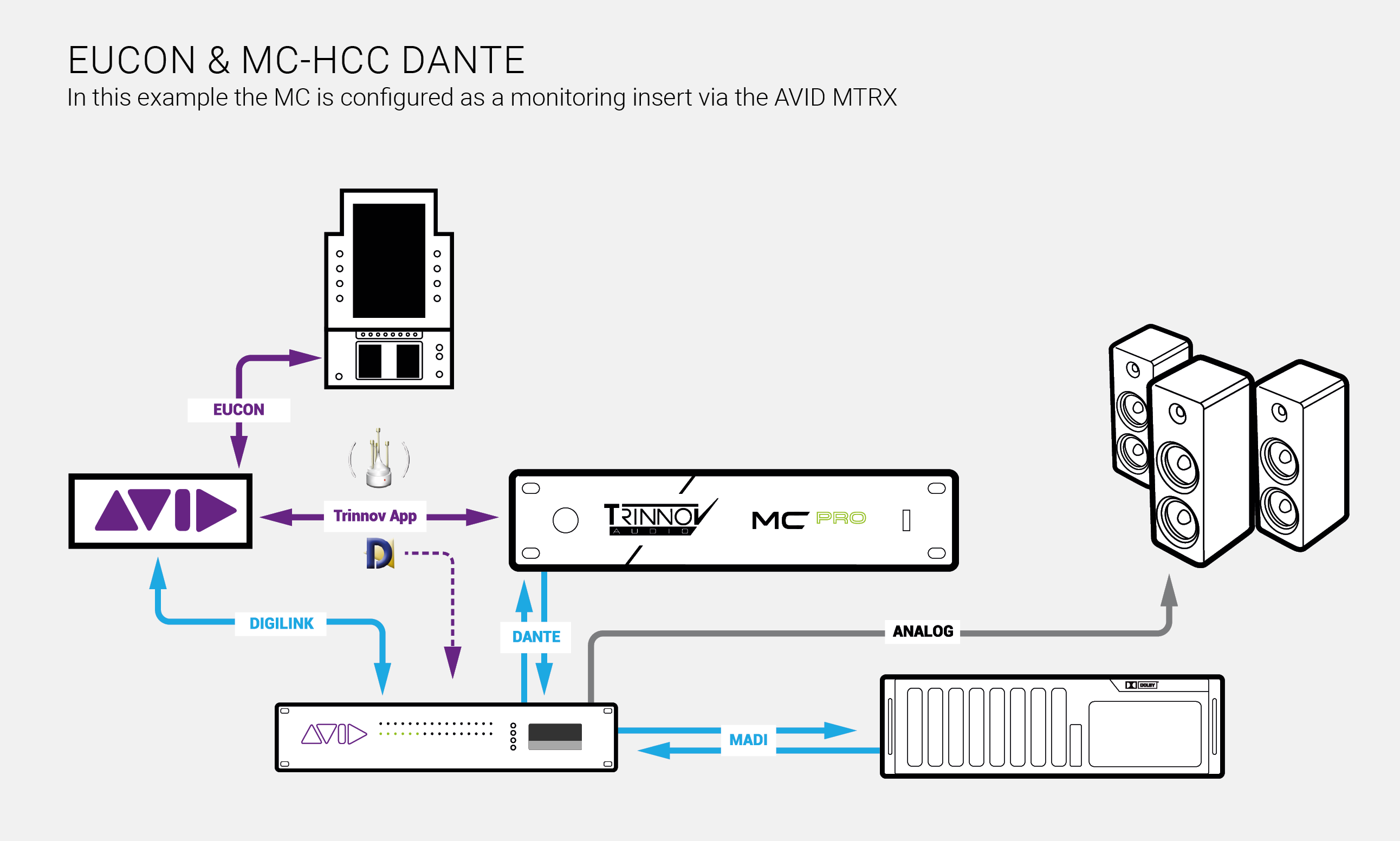 Audio signal goes from Protools to the RMU via the MTRX, gets back to the MTRX and is routed to the MC as an insert, then goes to the loudspeakers using MTRX DA converters.