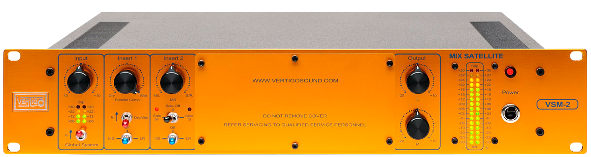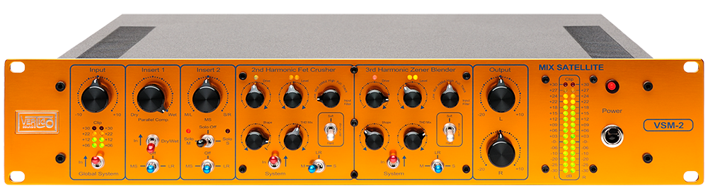 The Vertigo Sound VSM-2 is a creative fully analog Mix and Mastering tool. The VSM offers MS, Blending and two sophisticated coloration generators in 2U size. The VSM-2 is also available in a “basic version” without harmonic generators.