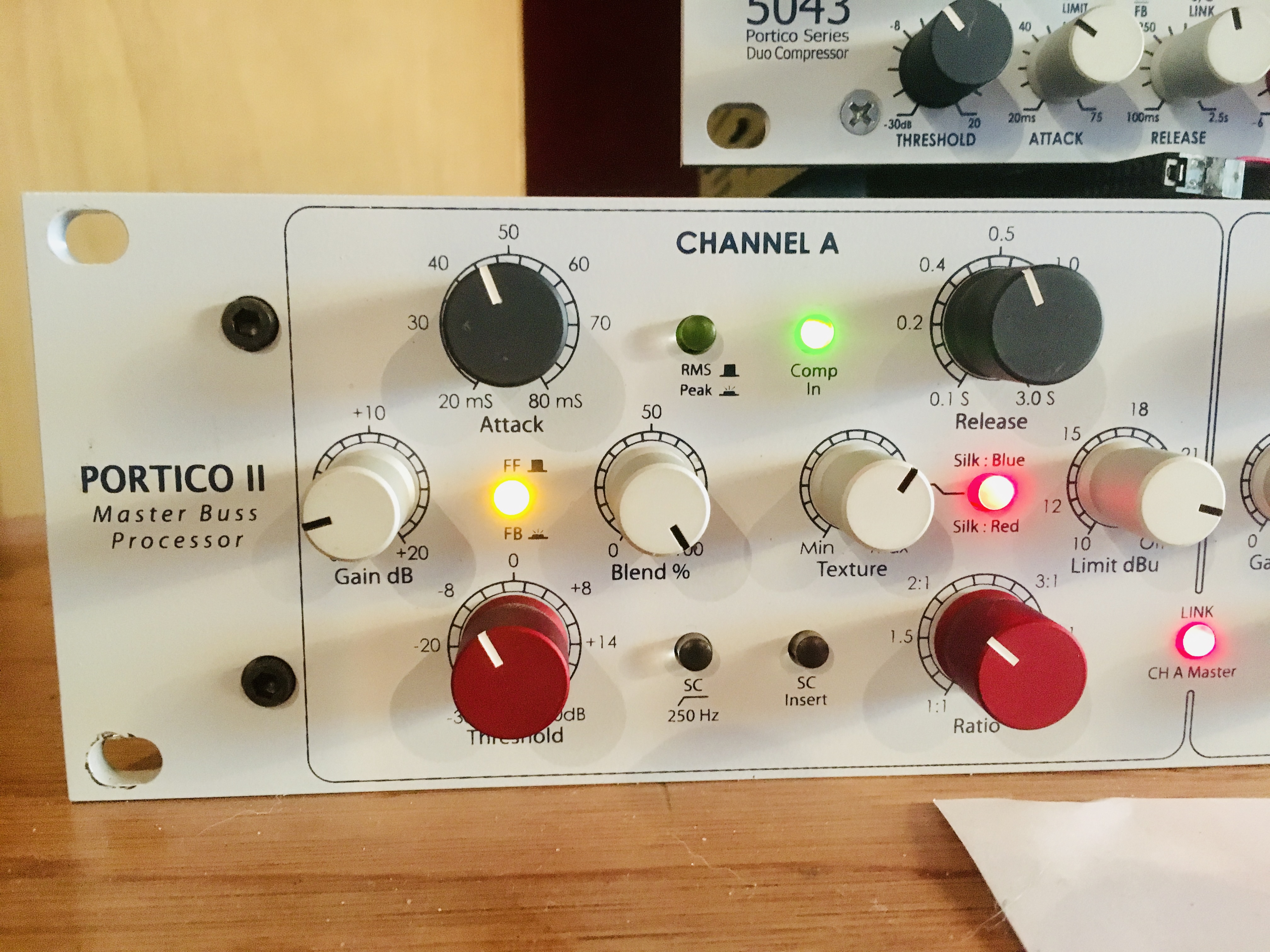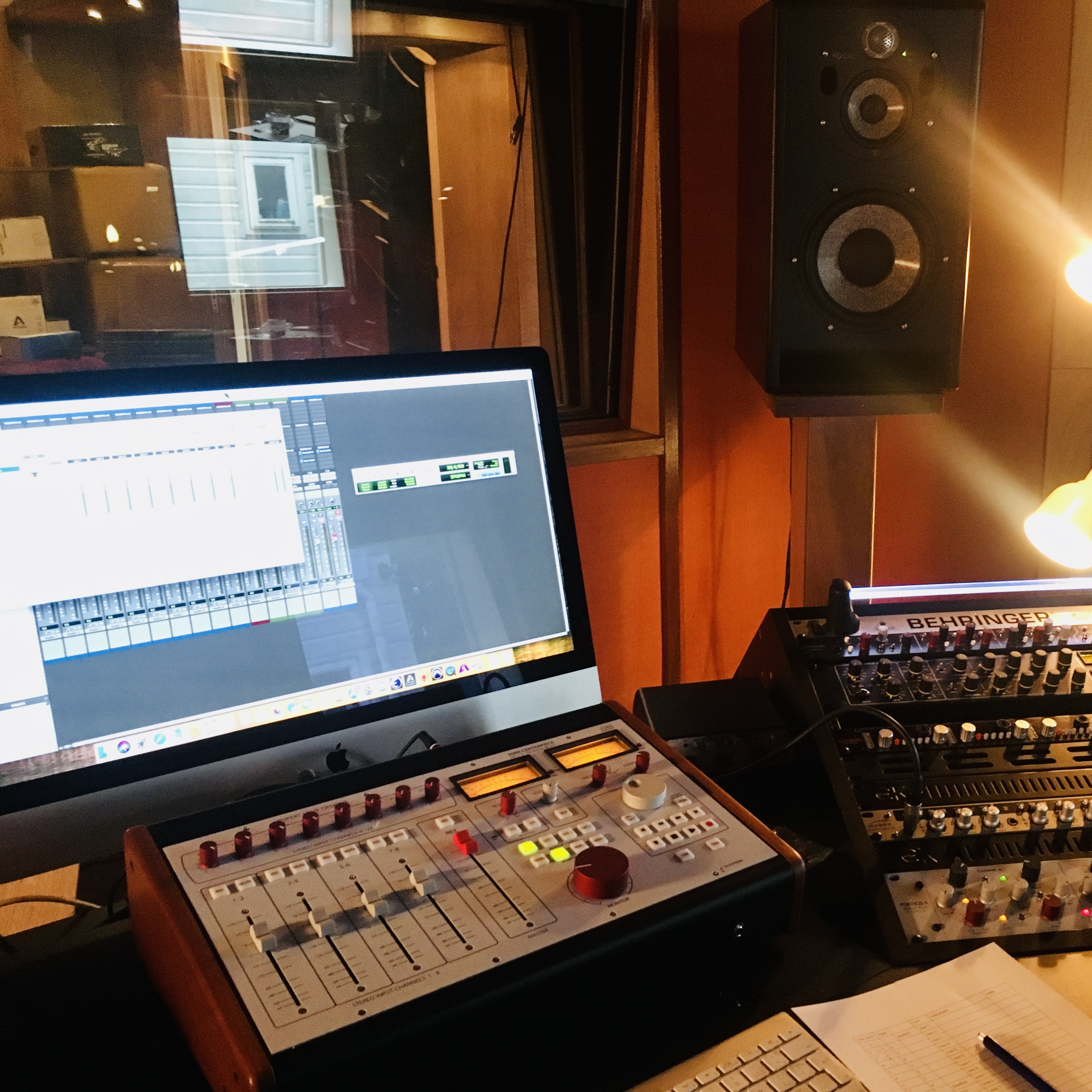 De control room biedt direct uitzicht op de landelijke omgeving. Er wordt opgenomen met Avid Pro Tools 12. De iMac draait via Thunderbolt op Apogee Symphony MKII met flexibele kaarten (max 32 i/o + 16 x optisch). Hierbij is het ook mogelijk je eigen Macbook of TB device mee te nemen. Indien gewenst is met bestaande sessies of eigen DAW op die manier te werken. De Sterling Plan-D 19 “ racks zijn exclusief gevuld met A-merk Pre-amps/Channelstrips, Eq en Dynamics van Rupert Neve Designs, TUBE-TECH, BAE, Eventide, Shadow Hills, Chandler limited, Phoenix Audio, Alan Smart, Empirical Labs, Bettermaker en Manley. De bezetting wisselt af en toe maar er is altijd een selectie van bovenstaand aanwezig. Summing en monitor controlling verloopt via een Shadow Hills Equinox of Rupert Neve designs 5060 Centerpiece.