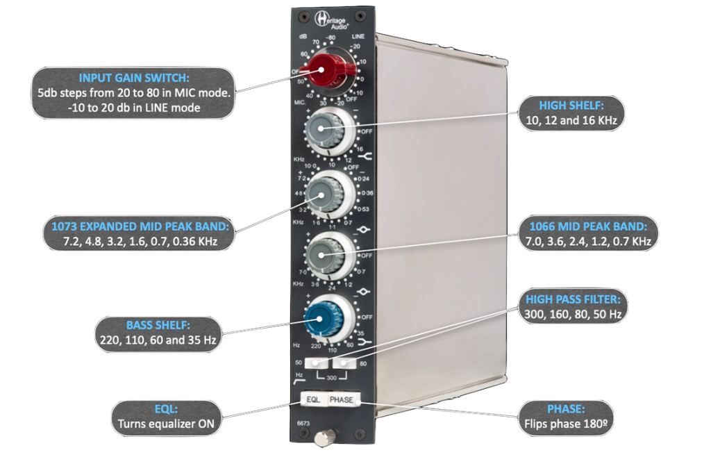 The 6673 is a 73-sized module, adding the 1066 mid band to the 73 classic design, creating a 4 band tone monster that is really hard to beat. In addition, the 73 mid band has been expanded in frequency choices, with the classic 73 ones kept untouched. It also features a Baxandall type High shelf band, but with the
