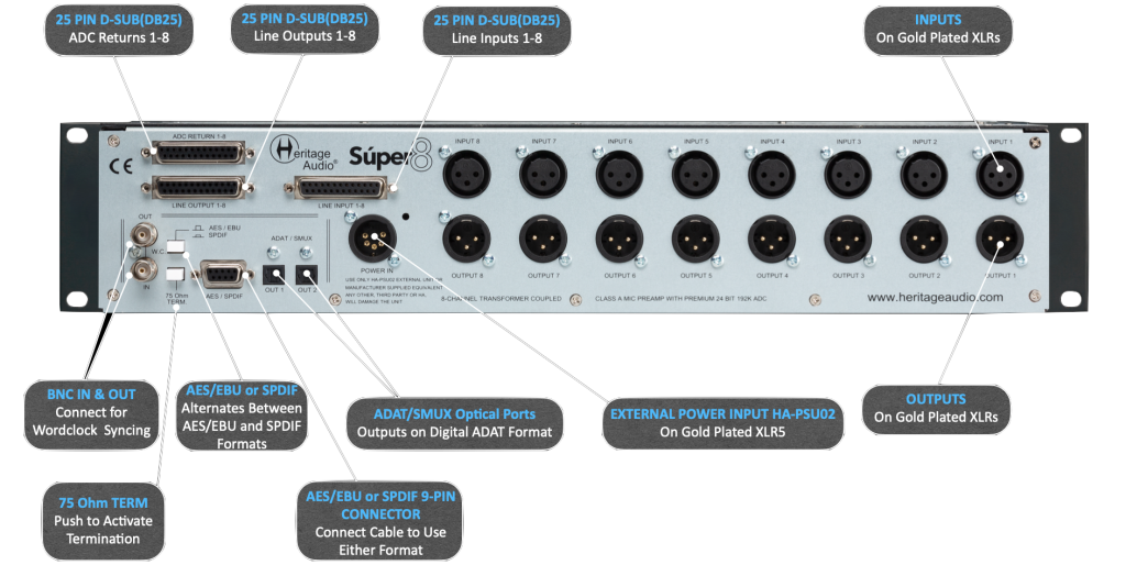 The built in analog to digital converter uses the latest technology to offer pristine conversion at a user selectable sampling frequency. The Súper 8 can either be the Master or Slaved to another unit as there is a BNC IN & OUT for reliable syncing. It even offers an alternate route to the converter via a DB25 connector to expand the unit´s flexibility.