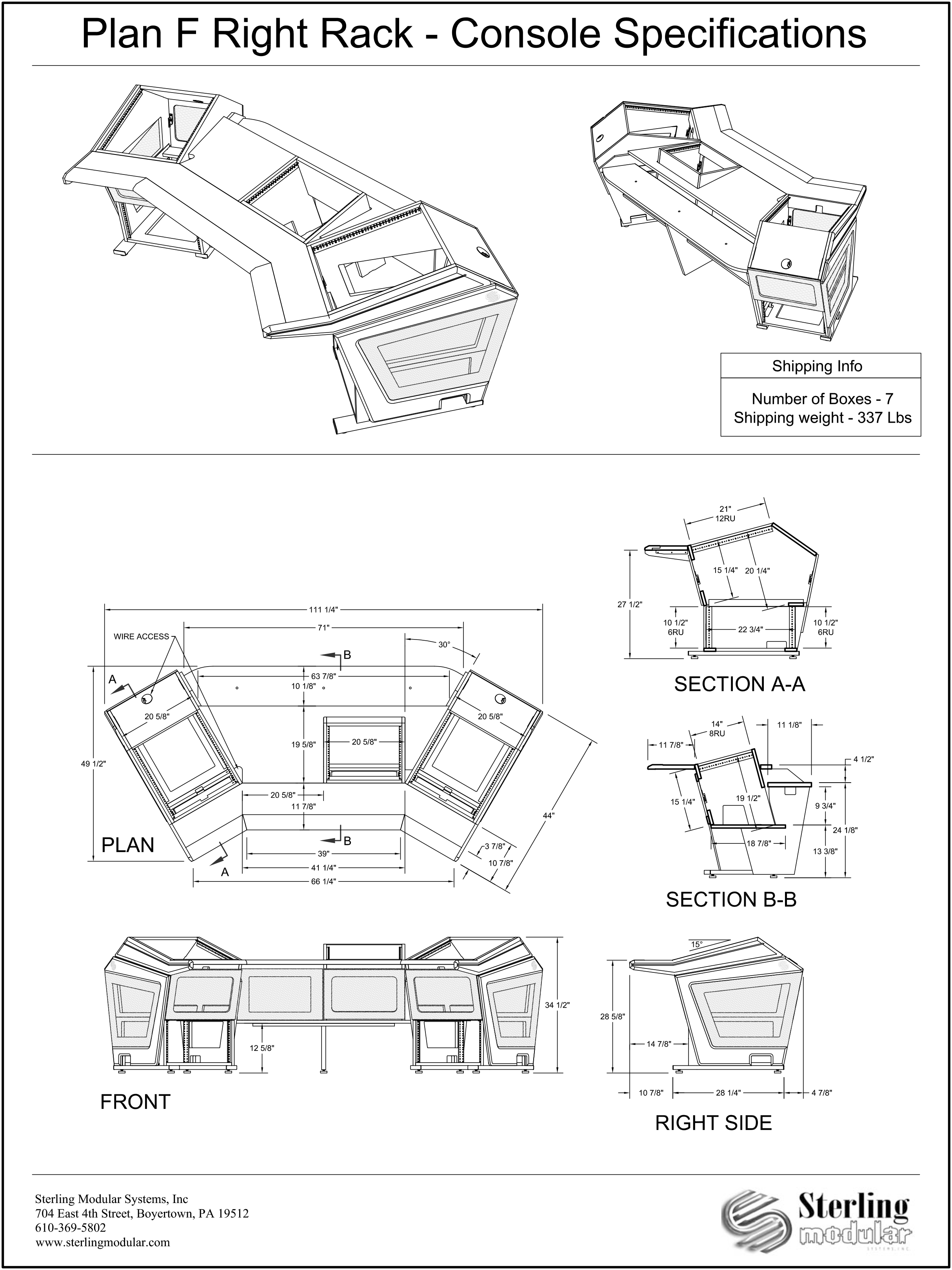 The Plan F is available in five standard configurations. The 8 ru middle rack can be located to the right, left, center, dual, or can be eliminated for maximum desk area (must be specified when ordering). There is a lower-rear monitor shelf that helps drop the monitors out of the sound field. There is enough space for two 30″ monitors to be placed side by side. The design features that reduce the acoustic footprint are present on this and all of our Plan Series consoles and Mixer Conversions.